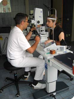 Herr Olbrich untersucht den vorderen Augenabschnitt einer Patientin. Das